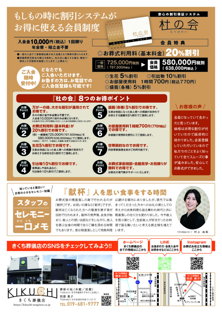 今月号は、もしもの時にお役に立つ会員制度「杜の会」のサービス特典についてご紹介させて頂きました。